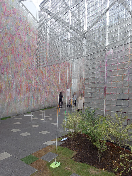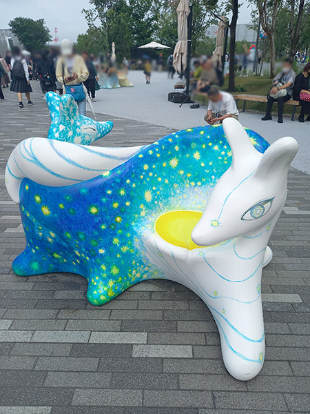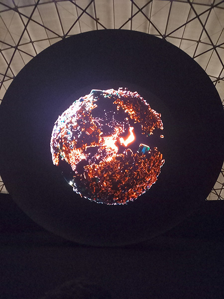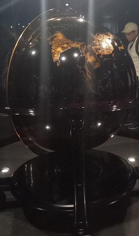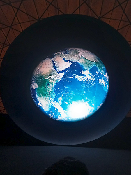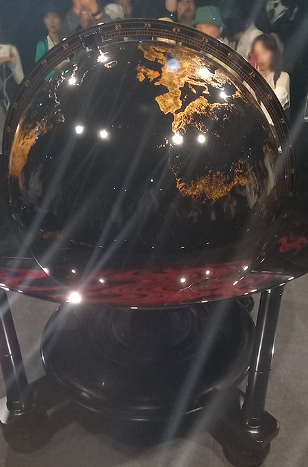 東ゲートからすぐのNTT館の庭を見学し、同じエリアの広場のベンチを撮影。その後、移動して夜の地球館で輪島塗りの地球儀を見た。