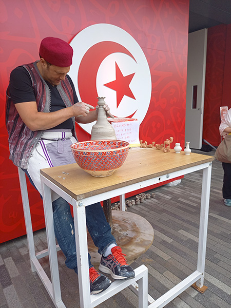 次いでチリ館に入場したが撮りたいというスポットがなく1分弱で出て、隣のチュニジア館の前でろくろを回していたおっちゃんに拍手して、吉本の前を通って西ゲートへ。2回目はいずれも一切並ばなかったが、心に残る物はなかった。人に聞くと、1時間半並んで入るパビリオンは感動ものだそうだ。万博を楽しむためには忍耐力が要る。ということは学べた日。