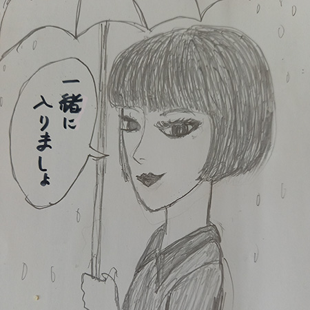 帰りはユニバーサルシティ駅から乗車する。この日は、駅に着くと同時に雨が降り出した。空いているホームの一番端は、屋根がない。でも、もう人込みは嫌だ。私はひとり雨の中、立った。傘を出すのも面倒だ、濡れてしまえ。と思っていたら、いきなり雨が止んだ。え? 人の気配に右隣を見ると、美しい女性が私に傘をさしかけてくれていた。そして、笑顔で「一緒に入りましょ」と。