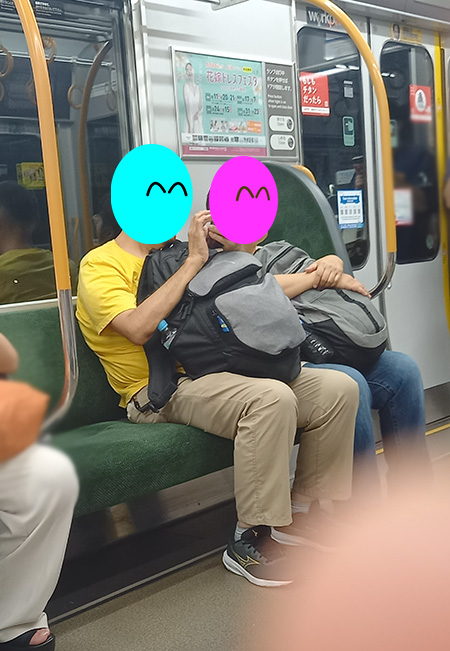 夏休み最終日かつ夏パス利用最終日で18万人が来場した8月31日。帰宅すべくユニバーサルシティー駅から西九条行のJR一番後ろの車両に乗って座ったら、1つ前の桜島駅(万博シャトルバスの乗降駅)から乗車している斜め前の夫婦が目に入った。