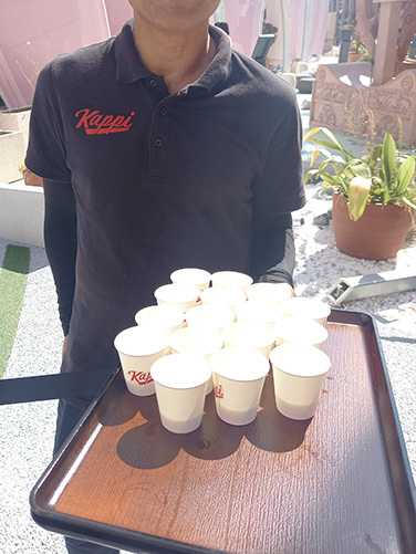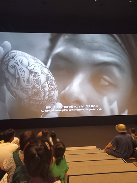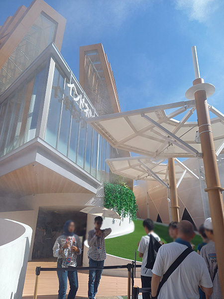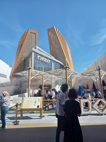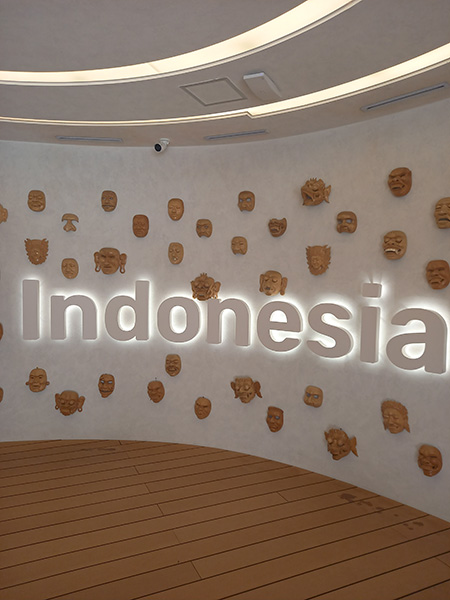 大阪の最高気温が37度超えの日。東ゲートから入るとすぐに大屋根リングの下へ行き、北回りで西ゲートへ向かう。と、西ゲート近くのインドネシア館で呼び込み中。待機列はリング下の日陰だったので、最後尾に並ぶ。待つ間、誘導スタッフが歌ったり踊ったりのパフォーマンスを披露。パビリオンに入る直前にはインドネシア産コーヒーの一口試飲サービスもあり、おもてなしぶりに感激。