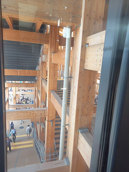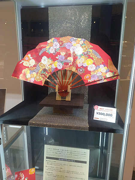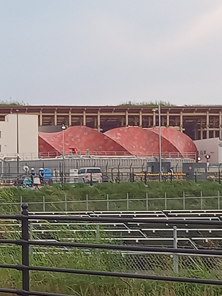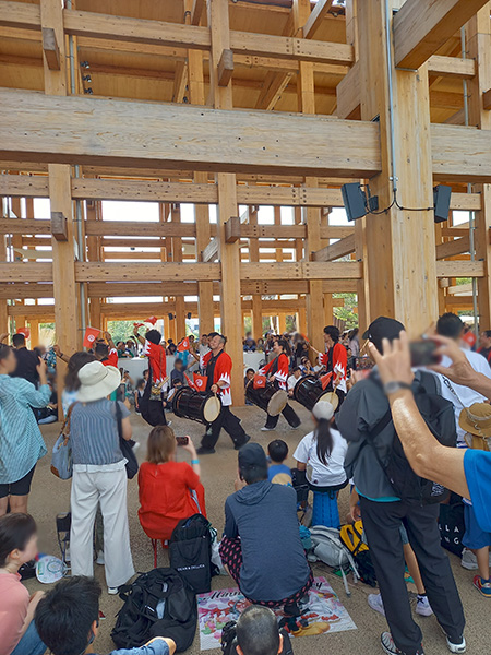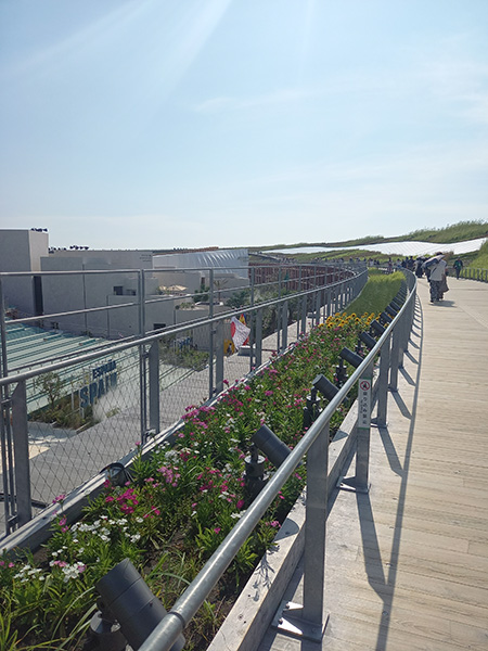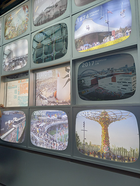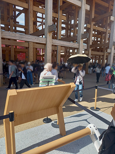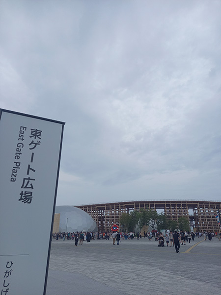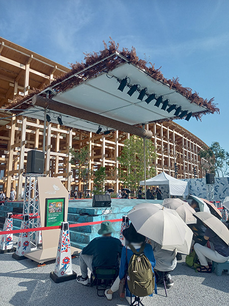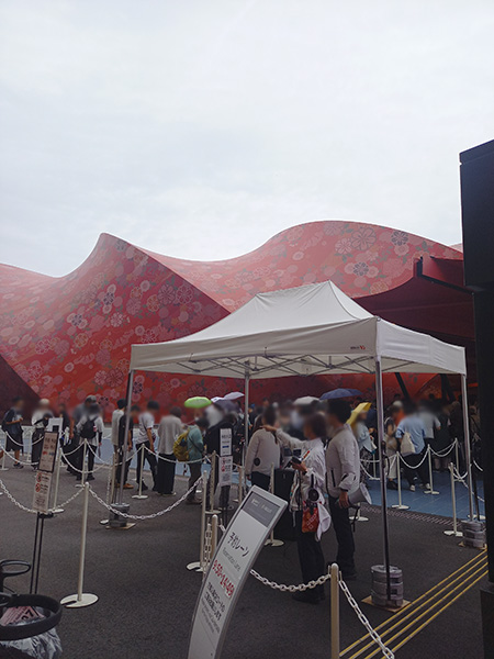 自身の体調に合った生活を提案する家の体験は50分待ちで断念。手描きの50万円の舞扇を見て会場を出た。会場から離れた第2交通ターミナルからでも「サステナブル・メビウス」を外観コンセプトにしたパビリオンは一目瞭然。尚、この建物は「世界最大の西陣織で包まれた建物」と「世界最大の扇子形の屋根」で2つのギネス世界記録に認定。観るだけでも価値あるパビリオンなのだ(と、あとで知った)。※悪天候で花火は中止