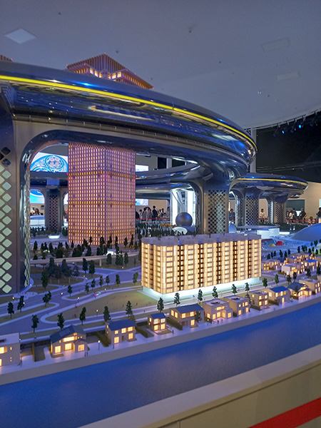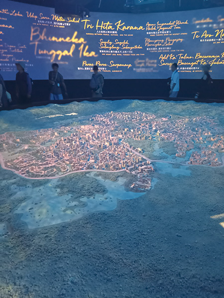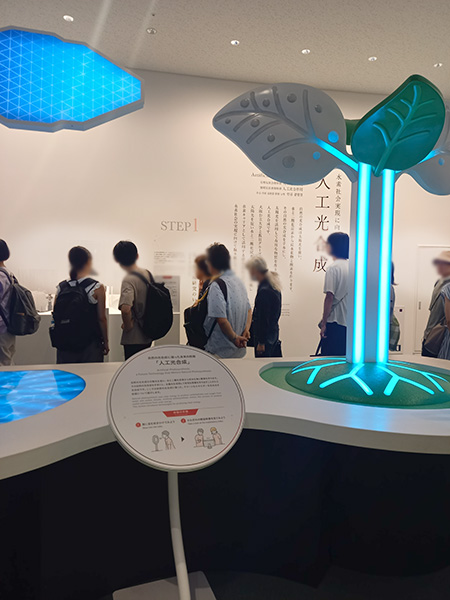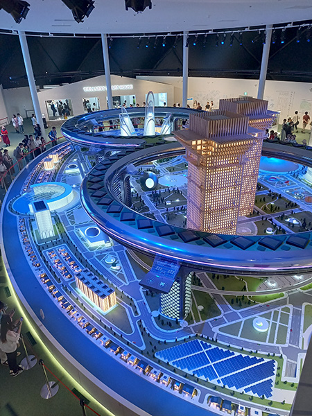 館内に入るとナビゲーターの女性が手話と英語を交え館内の紹介をし、数分のプロローグ動画を観た。その後、メイン会場へ進み各自で観覧。人工光合成の技術や未来のスマートシティの巨大ジオラマを観た。