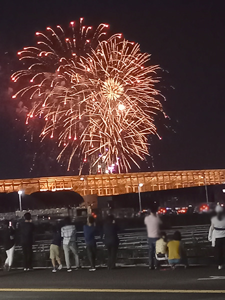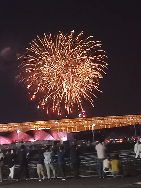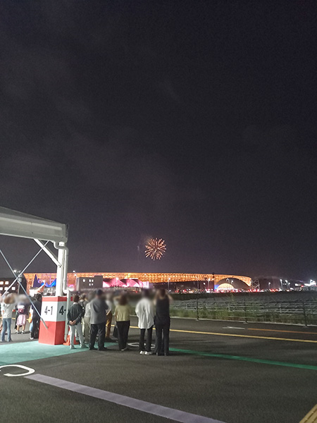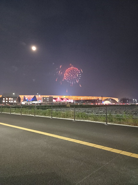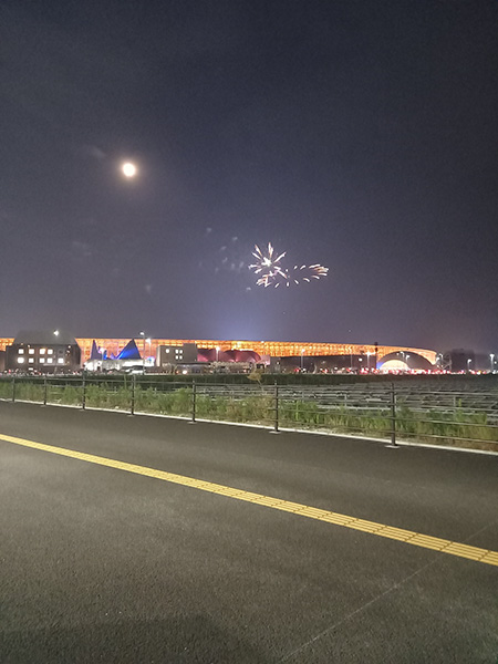 夜はEXPOアリーナでライブあり。山崎まさよしさんの歌声が聴こえ、少し気を取り直す。花火もあり。今回はアリーナも花火もズームで撮影した。