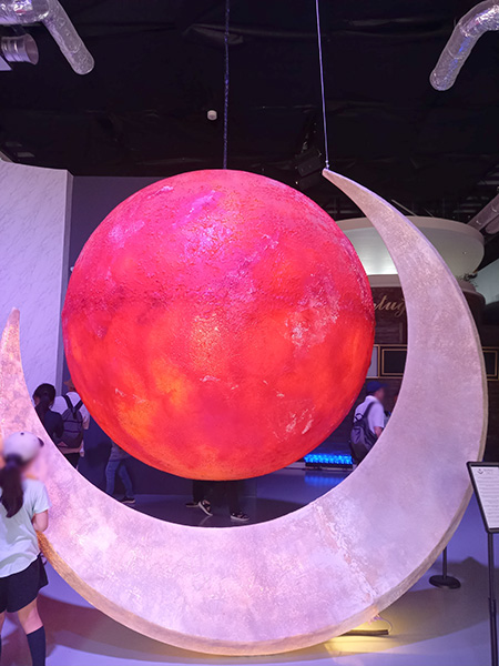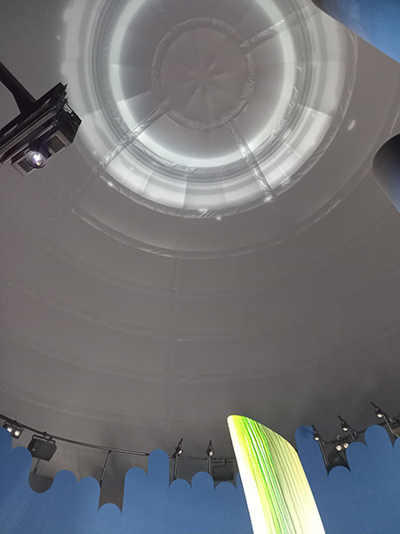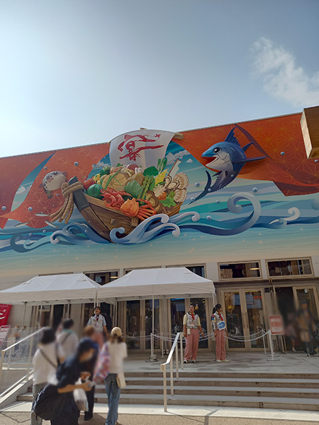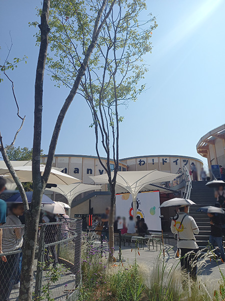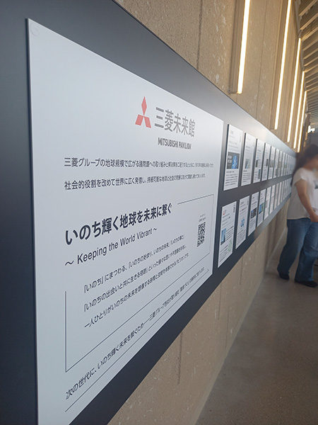 三菱未来館に当選。予約の14:50に受付し、影になる建物の下で4列に並んで10分待機。その後、階段を上がり、1階ロビーで5分程度のパビリオン紹介映像を見る。次いでエスカレーターで2階に上がり、映画館仕様の館内で10分間のアニメ映像を鑑賞。(撮影NGのため画像はない。)