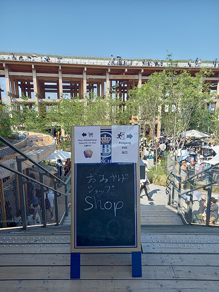 ドイツ館前通過時に予約なし入場のゲートを開放していたため、つい並ぶ。待ち時間30分と言われたが、25分で入場。入口で耳に直接当てて聞くゴムボールのようなキャラクター型イヤホンを渡され、各自説明を自由に聞きながら鑑賞するシステム。エネルギーに興味のある人ならじっくり見たいところだろうが、私は時間が気になりそそくさと出る。結果、館内5分で退場。と、イヤホンを返却する時、ふと思った。これ、消毒してるんかいな?(もちろんしているだろう。)館内は撮影不可のため写真はない。出口のいかにも外人さんが書いた看板が微笑ましかった。