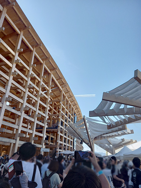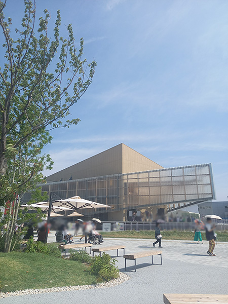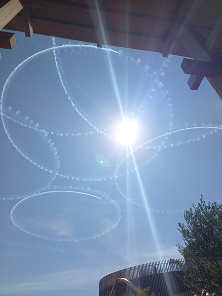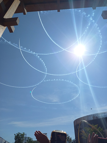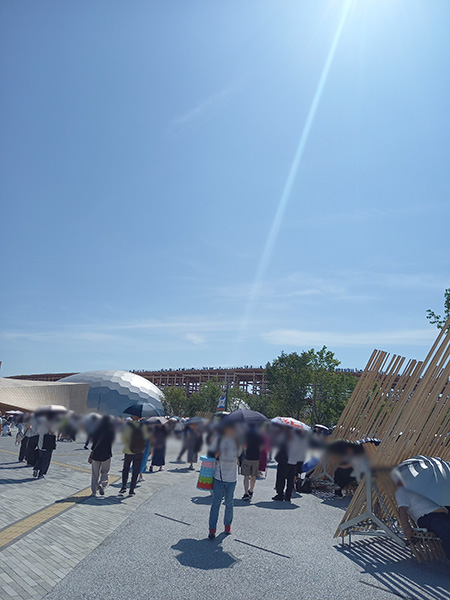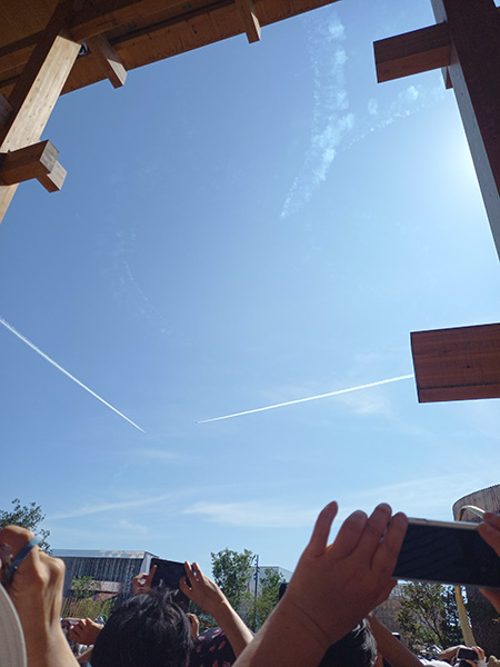 ブルーインパルスの飛行予定は15時だが、大屋根リングの上は早い時間から満員だ。リングの下もかなりの人だったが、移動する時間がないのでリング付近の日陰で待機。間もなく上空にブルーインパルスが姿を見せた。会場内には飛行のアナウンスが流れたが鮮明には聞こえず、周りの人の動きから飛んでくる方向を予想してスマホを構える。約10分の航空ショー。フィナーレではパイロットに届くはずないのに皆、拍手をし歓声を上げ「ありがとう」と叫んでいた。私も気が付くと手を叩き涙を流していた。万博での一番の思い出は、コレになると確信。