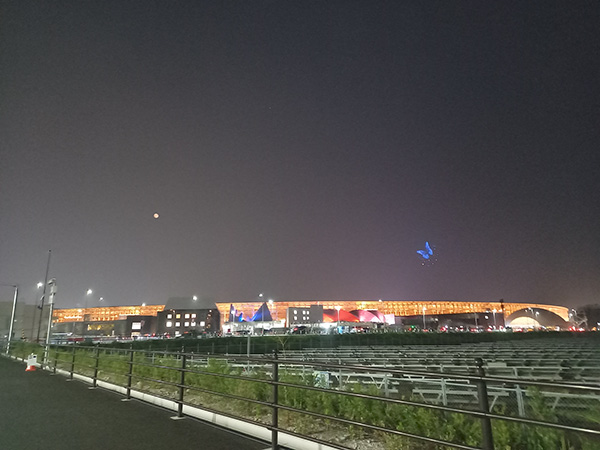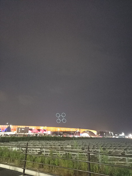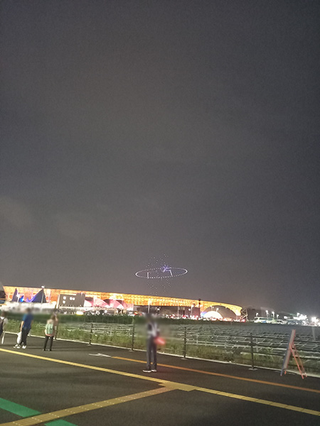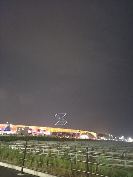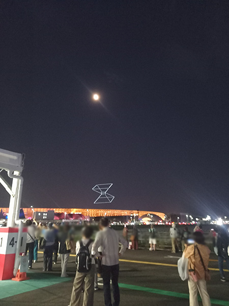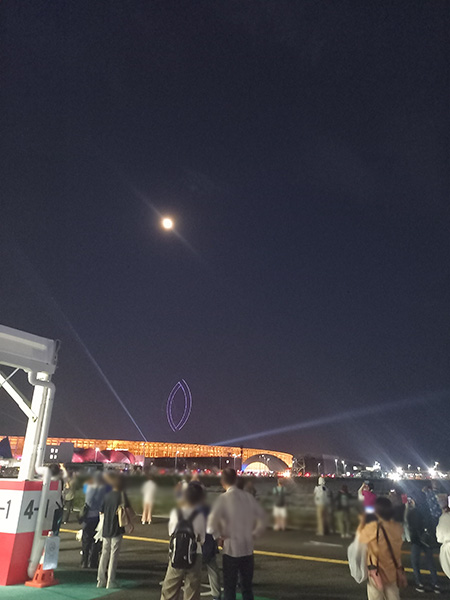 20時前のドローンショー。次回からこの時間は花火大会に変わるとの情報。見納め&撮り納めをする。