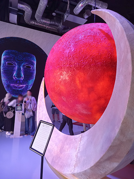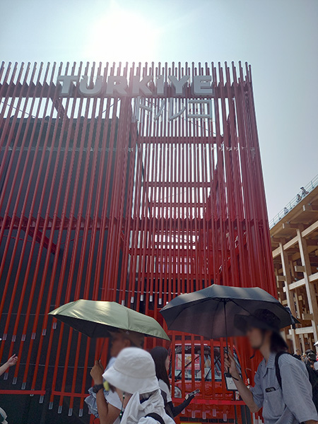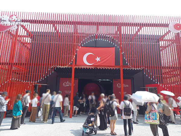 予約もプランもなく入場し、陽射しを避けて大屋根リングの下を東から北経由で西へ向かう。途中のトルコ館の前で、列の長さと進み具合、並ぶ場所が影であることを見て最後尾に付く。5分ほどで中に入り、トルコを象徴する月と太陽のオブジェをしばらく鑑賞。左横の壁に映し出された謎の顔が国の基本情報をアナウンスしていた。