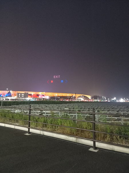 続けて近くのタイに並んだが列はなかなか進まず、前に並んでいるグループが口コミサイトを見て待つほどでもないと判断して列を抜けていったので、私もあとに続き、西ゲートを出た。(だって暑かったんだもの~。)夜は、私にとって4回目のドローンショーを観ることができた。プログラムは変わらないので、今回はラストシーンを撮る。最後に出口案内をするのは良いアイデアだと思った。