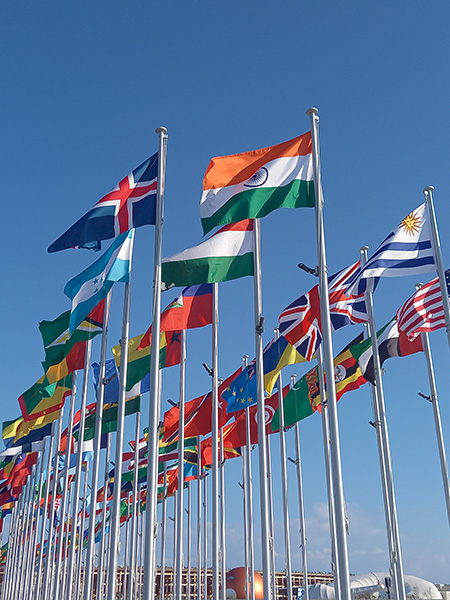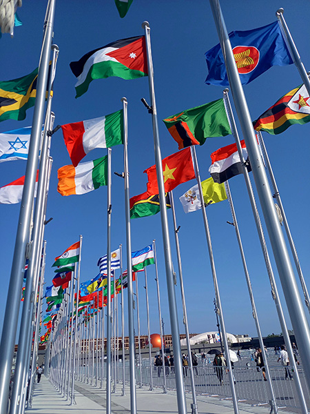 西ゲート前ではためく万国旗。5月と10月。空の色が違うなぁと思って撮ったけれど、人の数が違った。