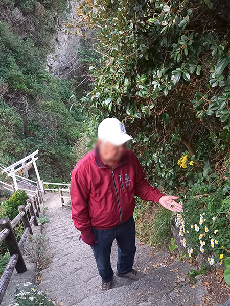 - 前夜に申し込んでおいた宿開催のガイドさん付き散策ツアーに出発。参加者は40代ぐらいの男性と私たちふたり。地元のガイドさんにあれこれ話を聞きながら、宿から500mほど離れた高低差約50mの白山洞門へ向かう。