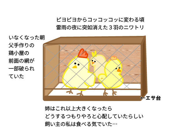 小学校の門の前にひよこ売りが来ていた。うどんで釣るのだ。1羽いくらだったのか。百円ぐらい? 初めて釣って持ち帰った時、おばあちゃんの部屋で見せていると、庭にいた祖母の飼い猫タマが、しばらくこっちを見ていたかと思うと、一瞬でかっさらって行った。あまりの早業に茫然。その次のひよこの記憶は、庭で父の手作り鳥小屋に3羽ほど飼っているシーンだ。黄色から白くなりトサカが生えてきて、間もなくおいしいチキンになるというある早朝、バタバタと羽音と鶏の叫び声が聞こえた。外に出て鳥小屋を覗くと、網が破られ1匹もいなくなっていた。