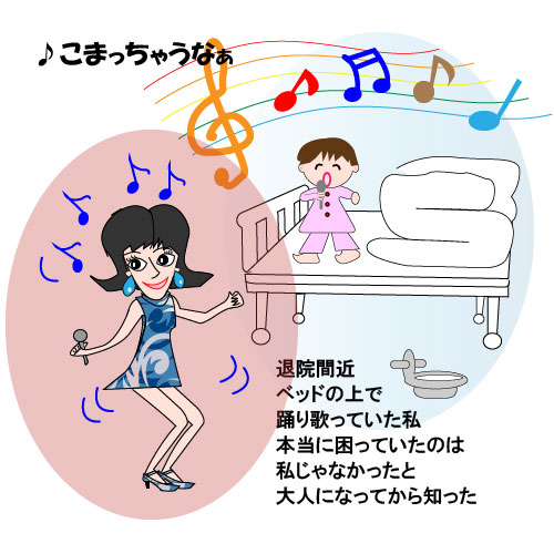 山本リンダさんの『こまっちゃうナ』発売は昭和41年(1966年)、私が2歳の時である。私はこの歌を病院のベッドの上で踊りながら歌っていた記憶がある。もう3歳になっていたかと思うが疑似赤痢なる病名で2週間、隔離入院させられていたのだ。入院前から入院後もしばらく続いた腹痛と吐き気は涙がちょちょ切れる辛さだったし、見舞いに来てくれた従兄達と仕切り越しにしか会えず、お見舞いグッズも見せてもらっただけで触ることはできない寂しく不自由な生活は幼心にストレス満タンだったのだろう、ひたすら「こまっちゃうナ~」と歌い踊っていた。が、本当に困っちゃっていたのは私ではなく、一緒に入院させられた母親(洗濯以外にやることがなく、自由に入浴できなかった)、まだ4歳の姉(祖母だけでは手に負えず親戚中をたらい回しされていた)、さらに保健所が家を消毒に来てご近所に恥ずかしい思いをした同居家族だったと後になって知った。いや、ホンマ堪忍。