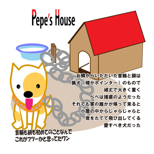 倉庫に連れていかれたトラウマだろう、ペペは遠出を嫌がった。私も従姉も受験やらで忙しくなり散歩に連れて行くこともなくなった。そうしてペペの散歩は、各自自由散策方式に。夜の9時になるとくぅんくぅんと鳴き始める。私は鎖を首輪から離す。ペペは元気よく飛び出していく。30分後、犬小屋を覗くとペペは既に休んでいる。なので鎖を首輪に付けて終わり。今、こんな方法で散歩させてたら訴えられるだろうな、うん。昭和の生き物